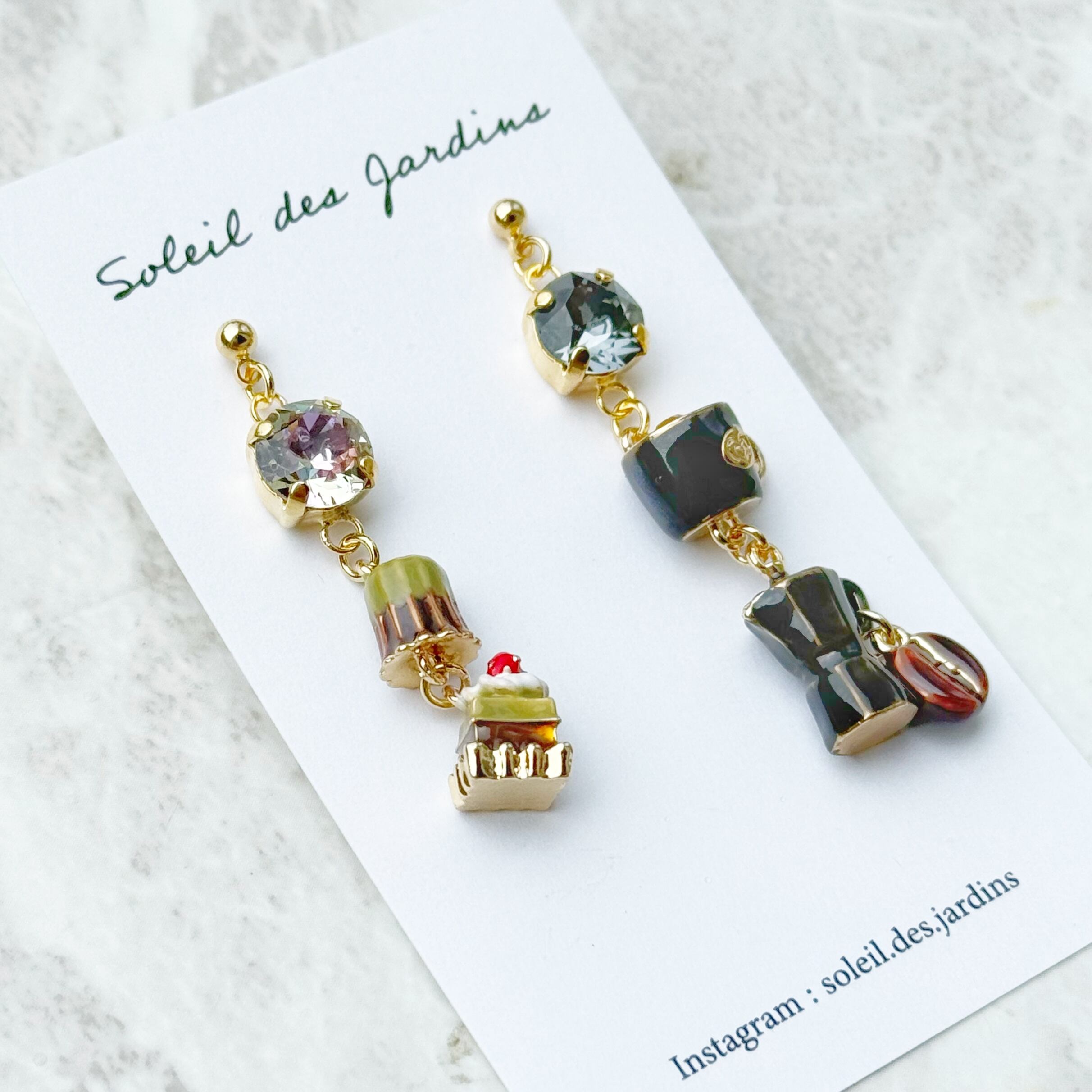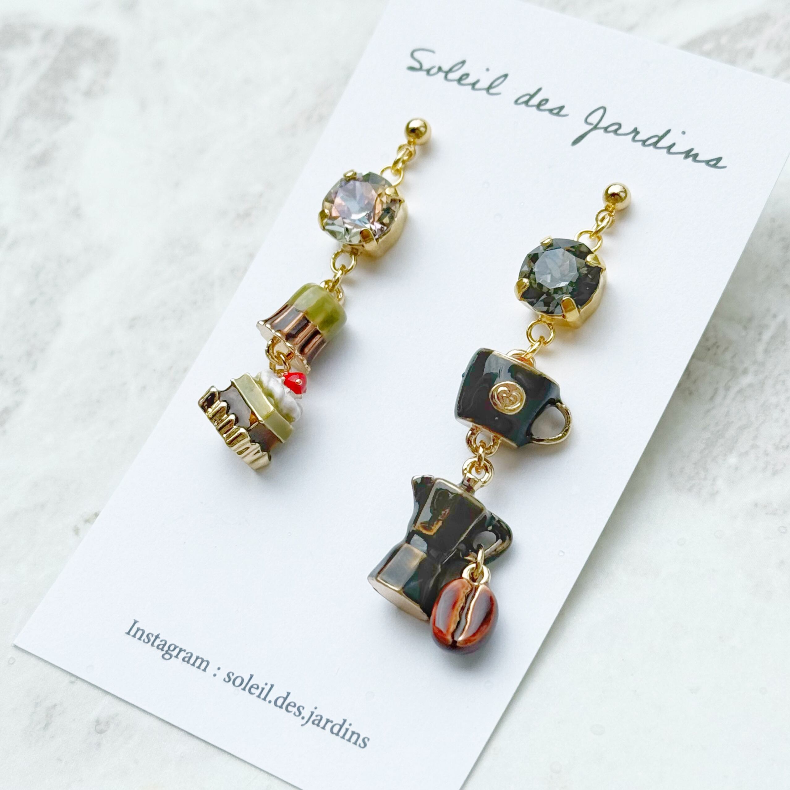抹茶ケーキと抹茶カヌレ、コーヒーチャームを使用して、スイーツてんこ盛りのピアス/イヤリングを作成しました。