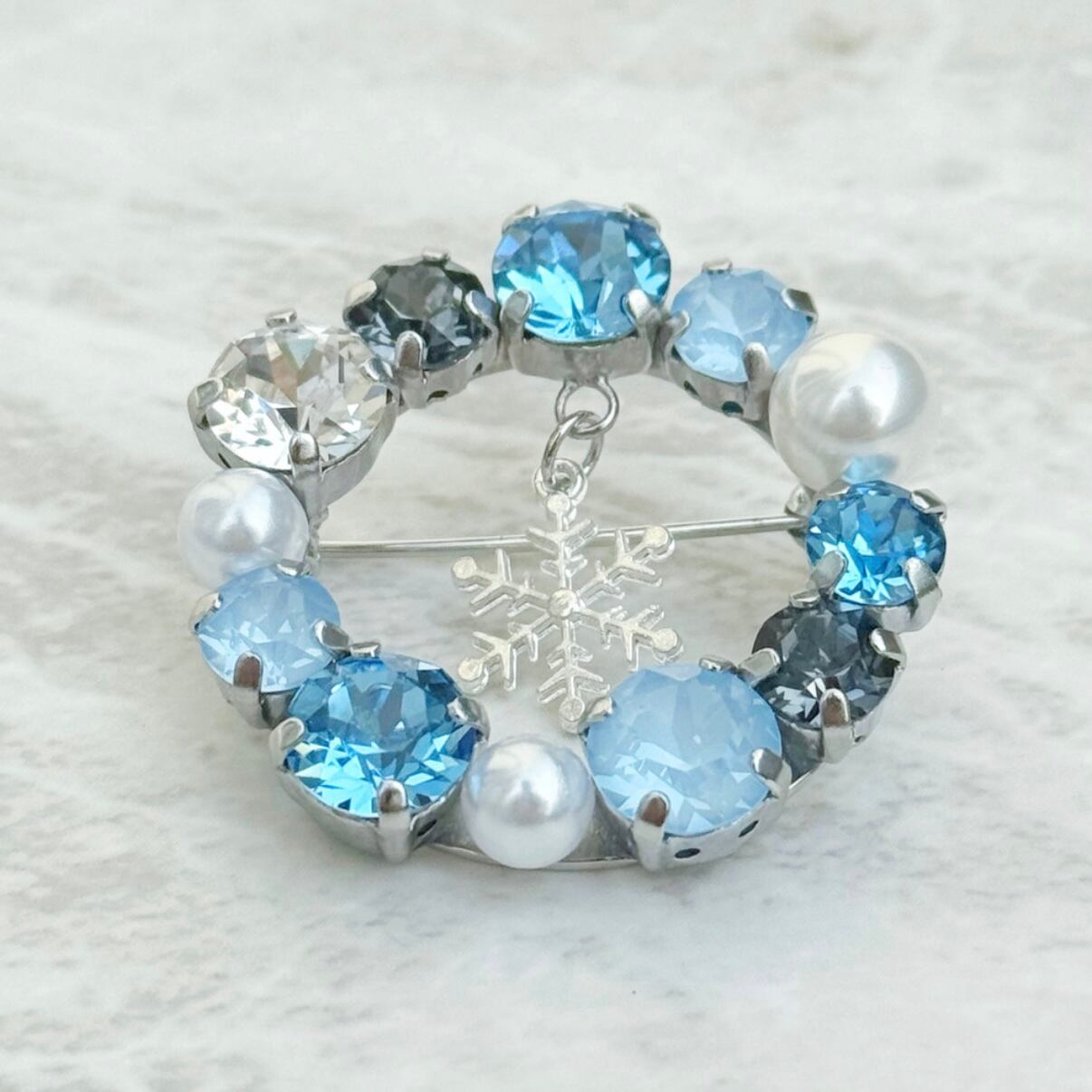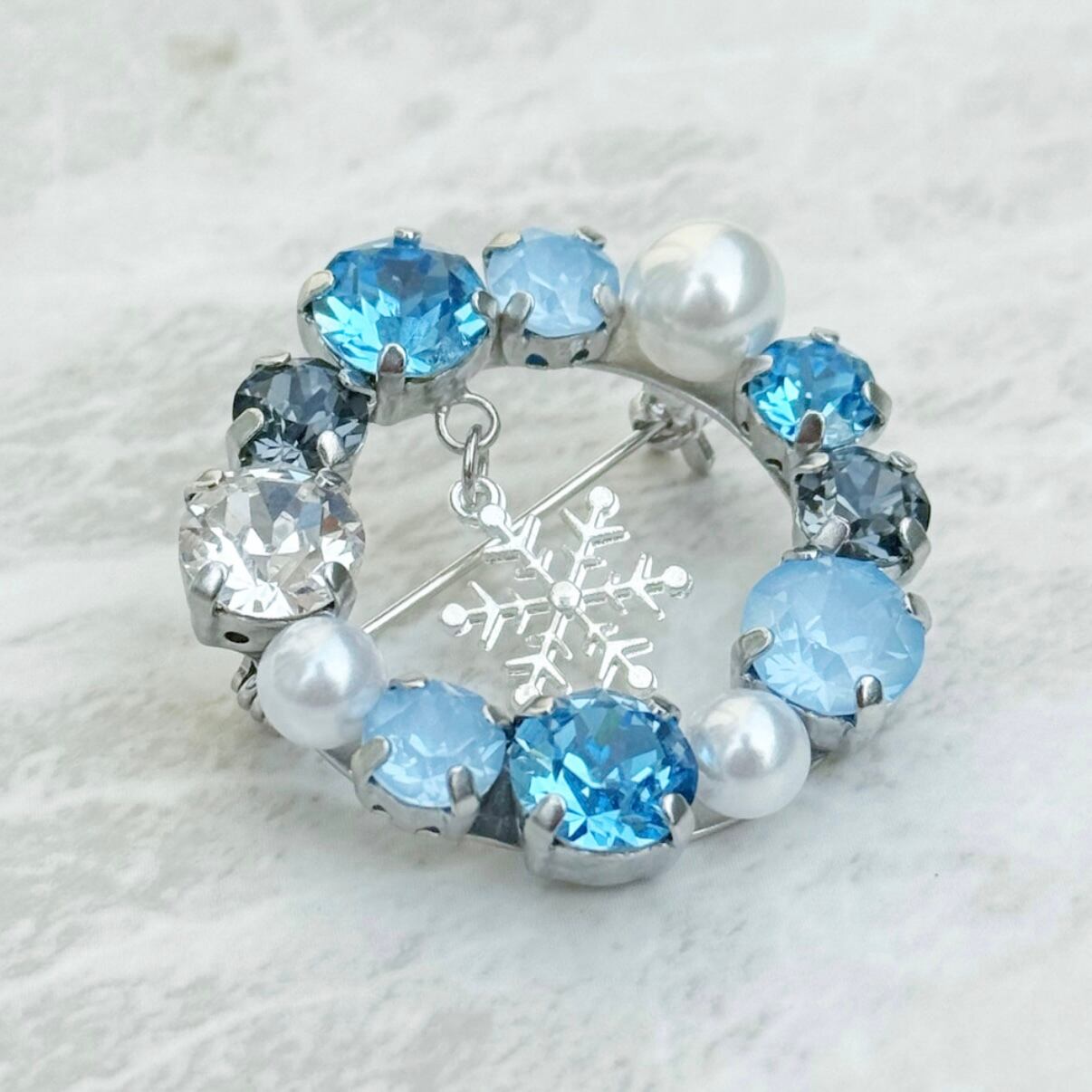 澄んだ冬空を思わせるブルーとグレーのスワロフスキーに、きらめくクリスタルを合わせた、上品で洗練されたウィンターブローチです。