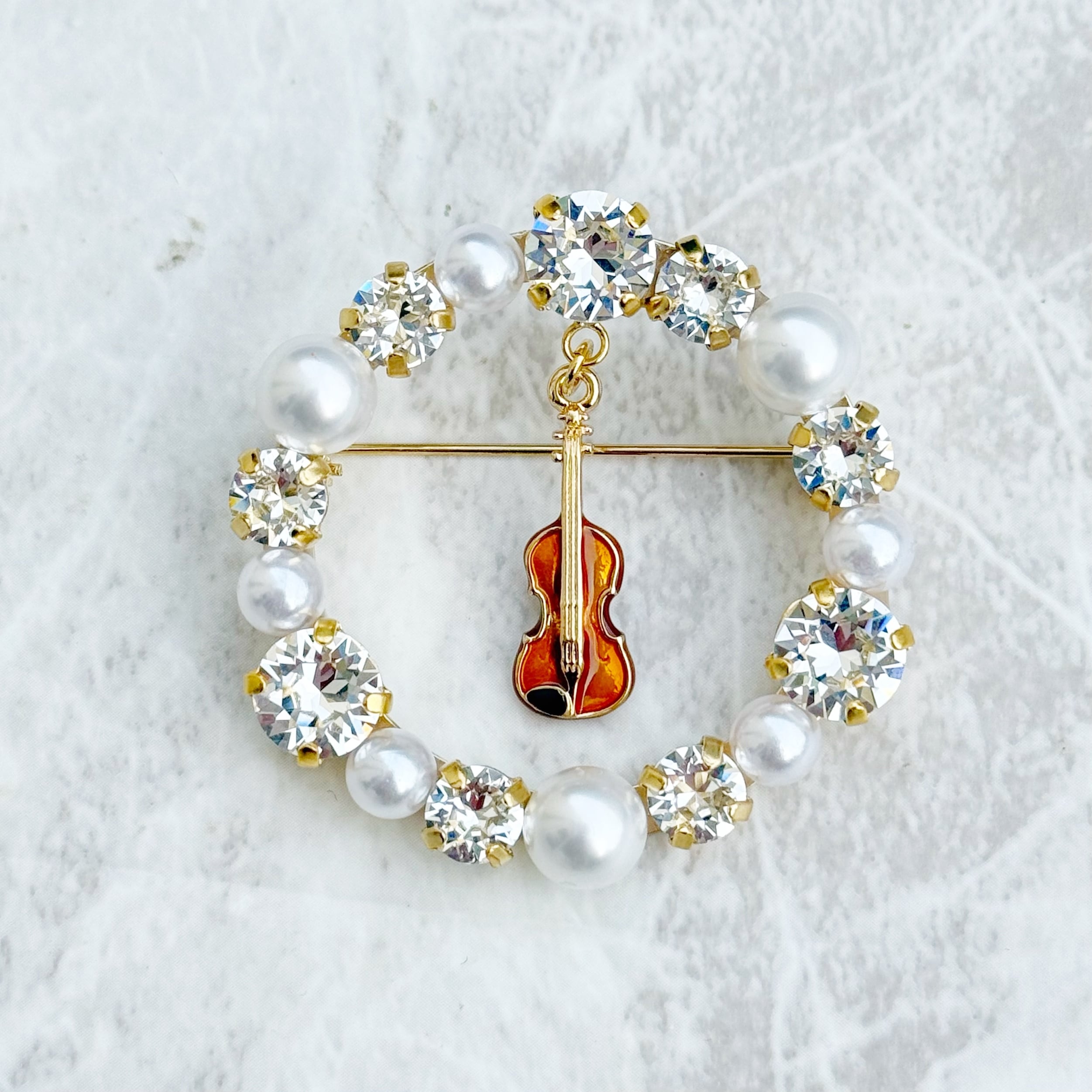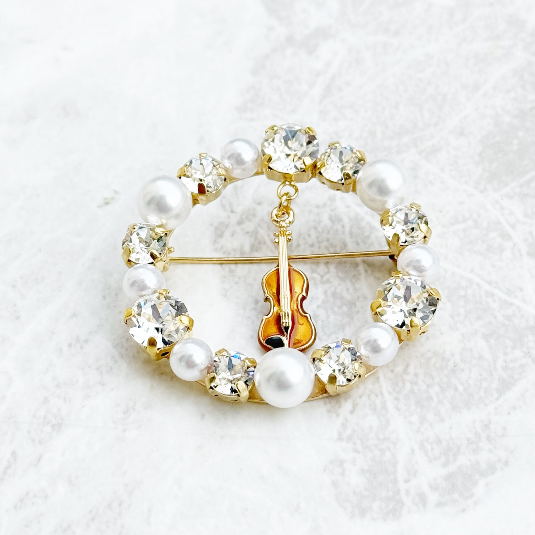 バイオリンチャームとスワロフスキーを使って、ブローチを作成しました。