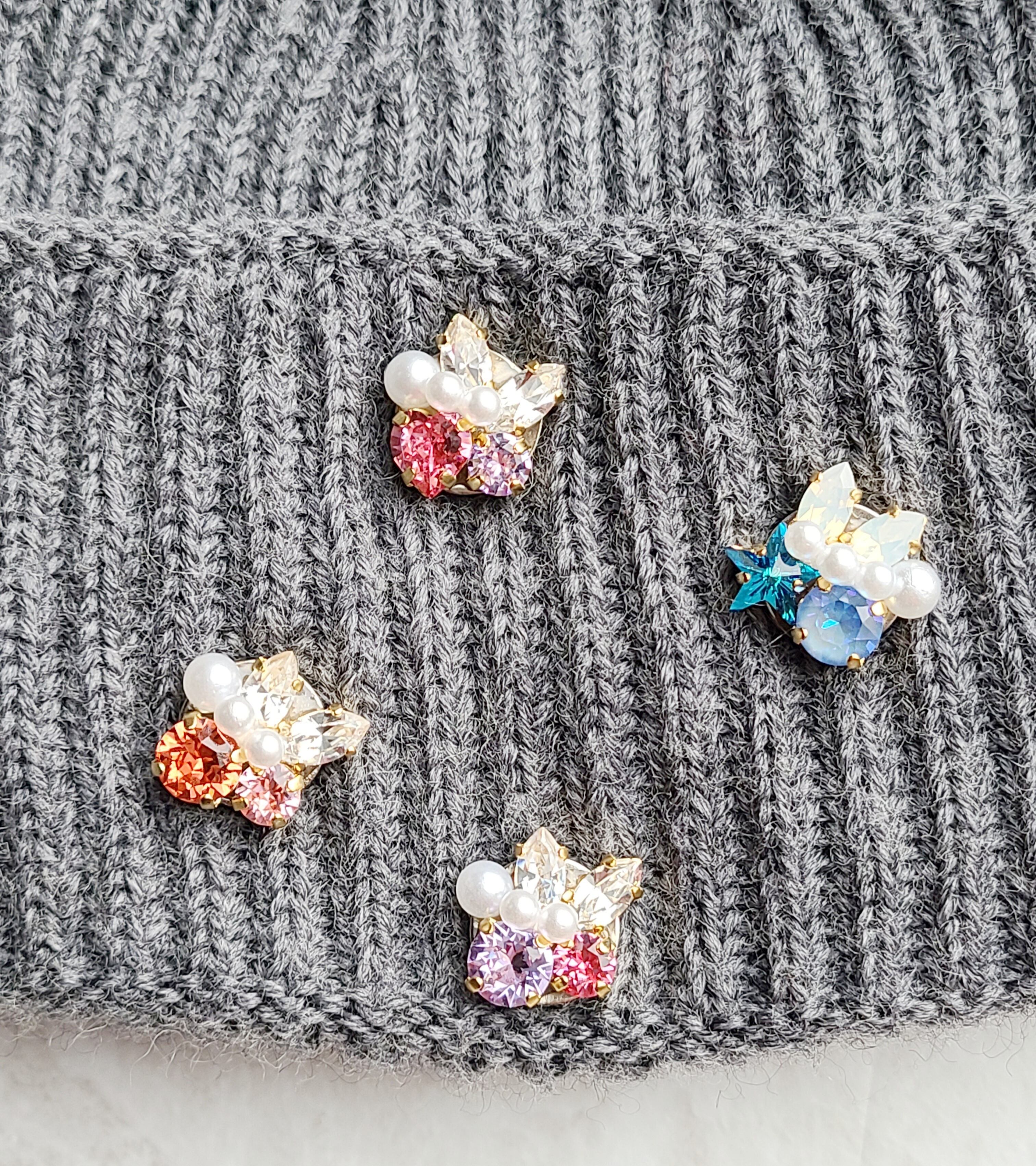洋服やストール、マフラー、キャップ、ニット帽など様々な用途に使えるブローチです